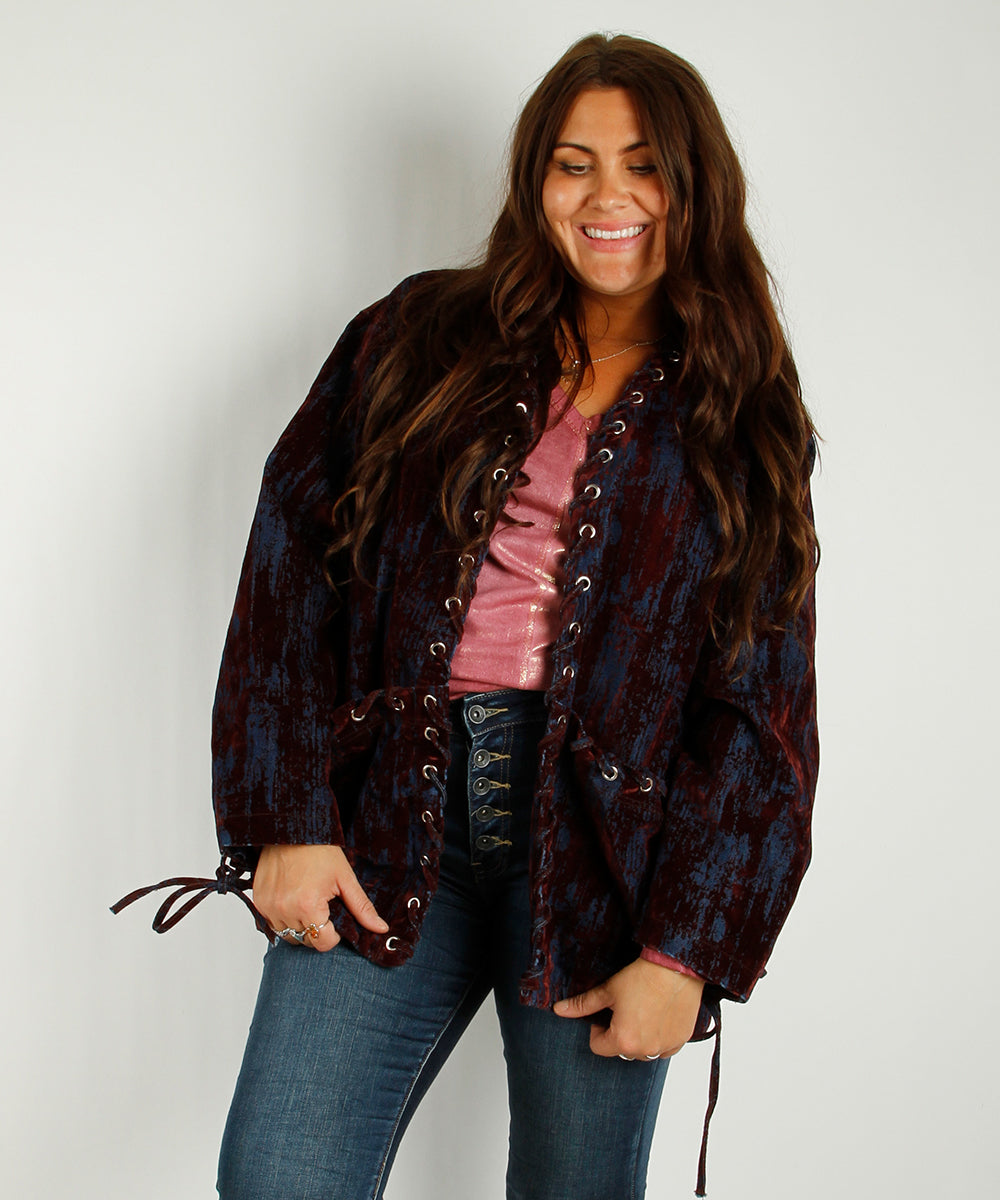 Jakken har en unik snøring med maljer langs hele fronten og de store lommene foran.