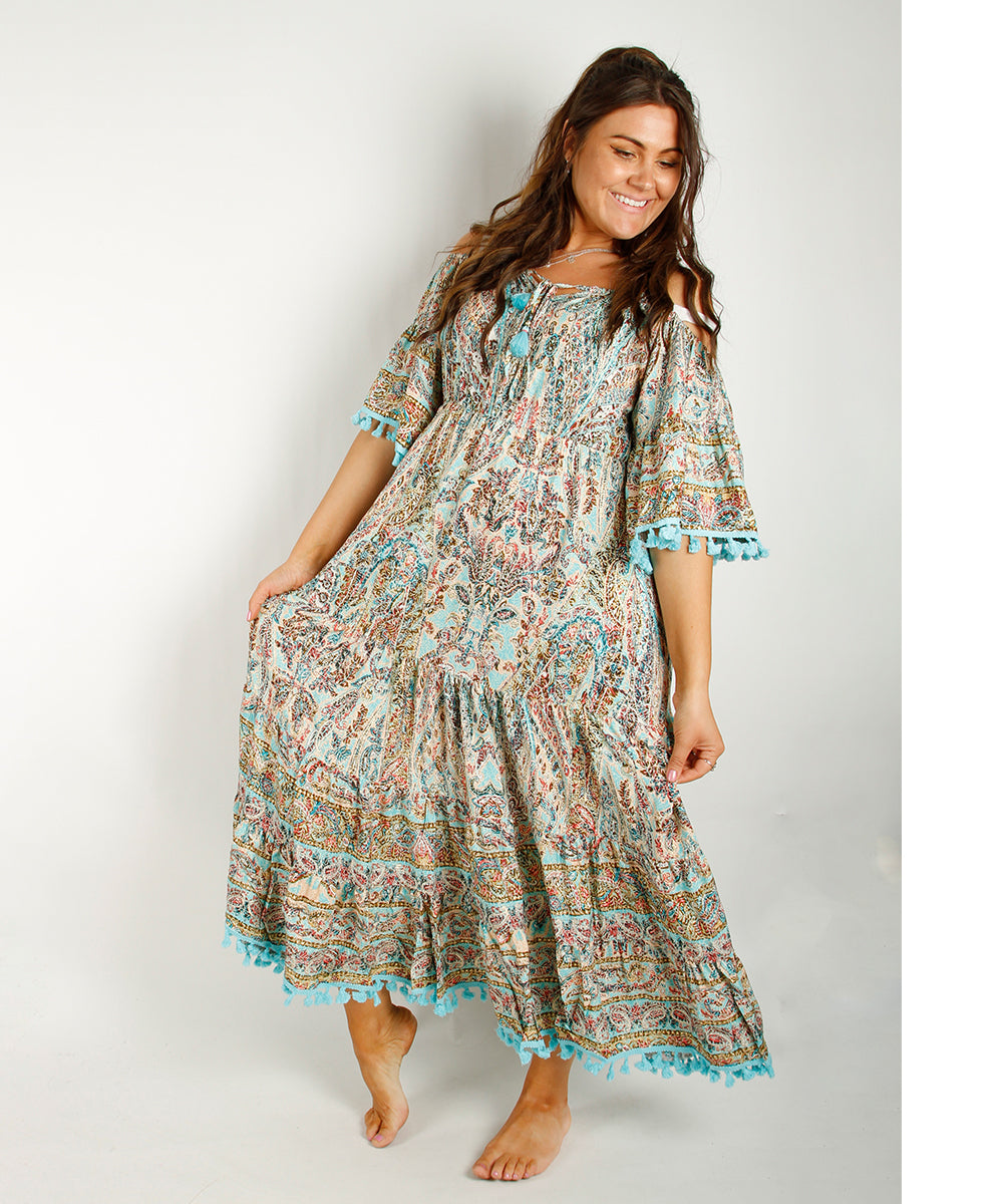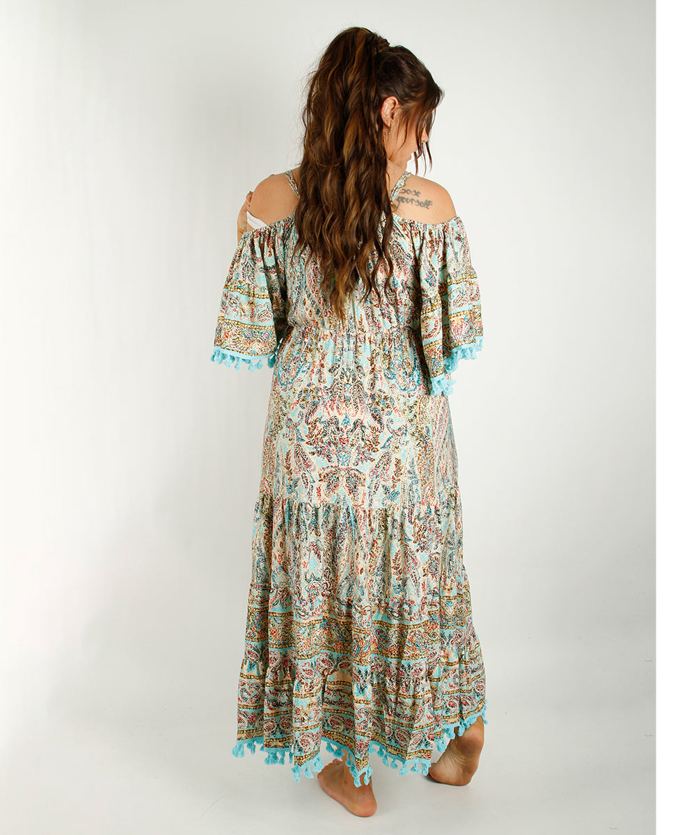 Kjolen har en delikat skulderløs passform, med stropper og vide ermer.