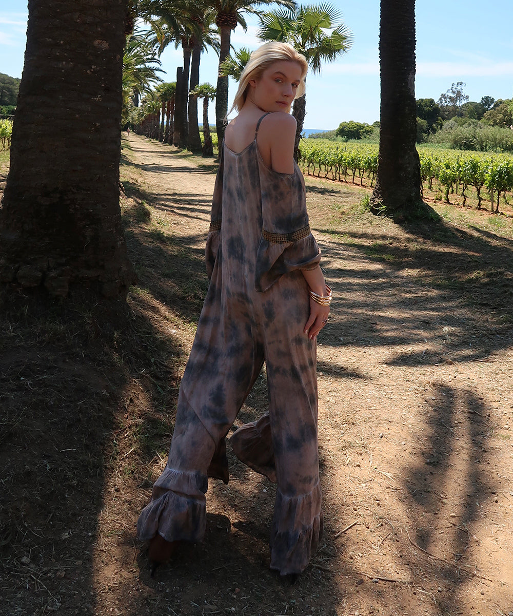 Materialet er 100% viskose, som gir en myk og behagelig følelse mot huden. Jumpsuiten er uforet, noe som gjør den lett og ideell for varme dager.