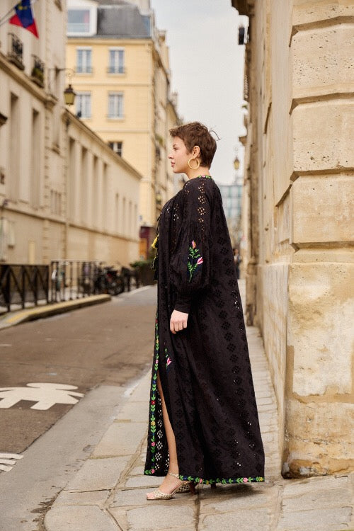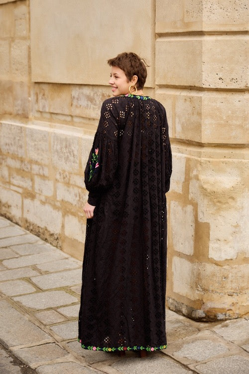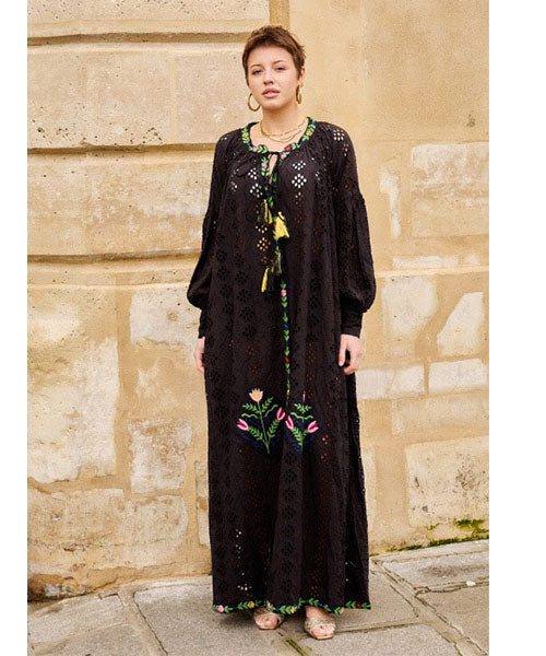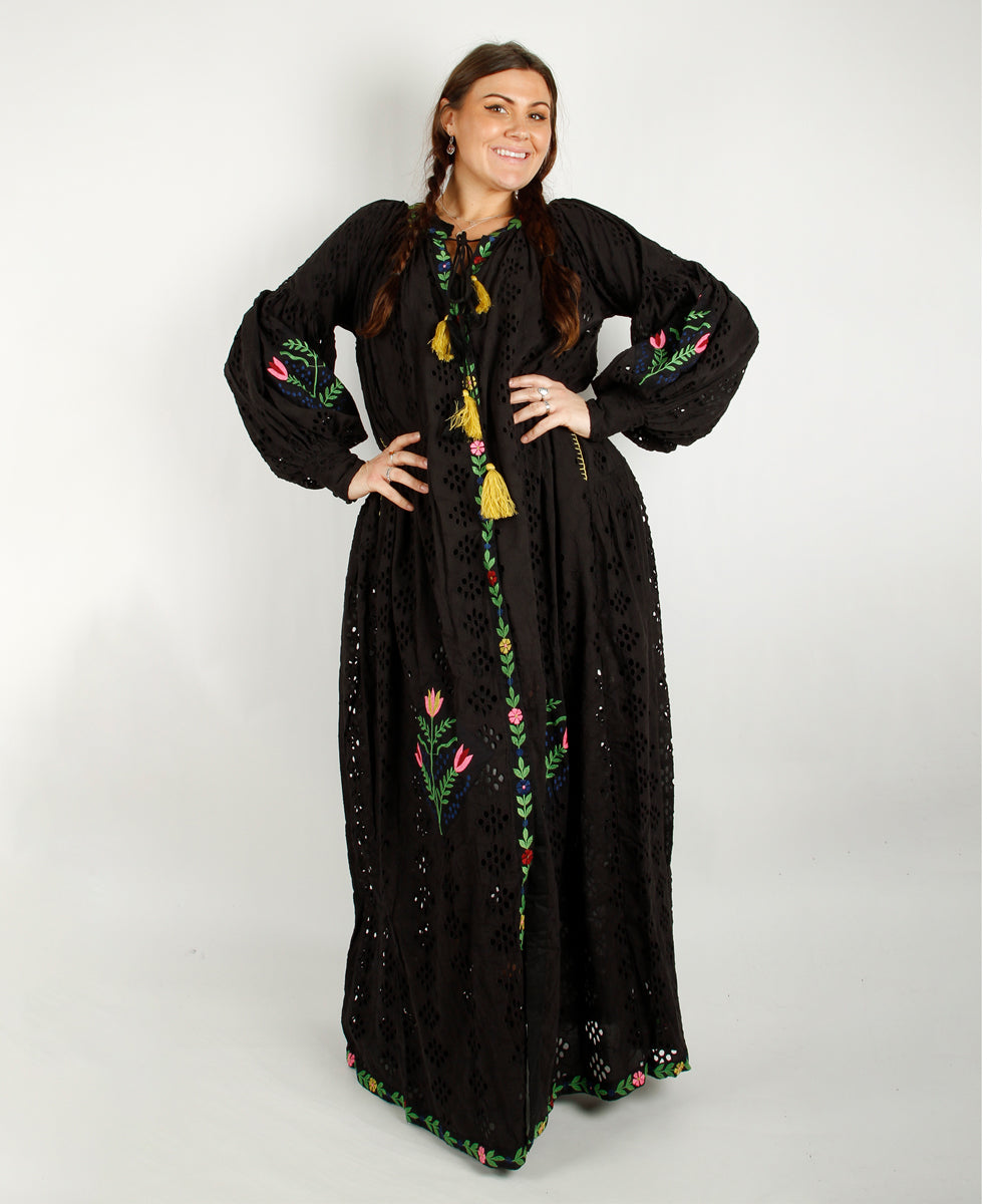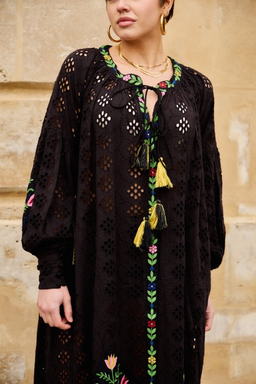 Dette er en vakker svart kjole med delikate hullbroderier og fargerike blomsterdetaljer. Kjolen har en løs og avslapper passform. Den har dyp v-hals og knytebånd med dusker.