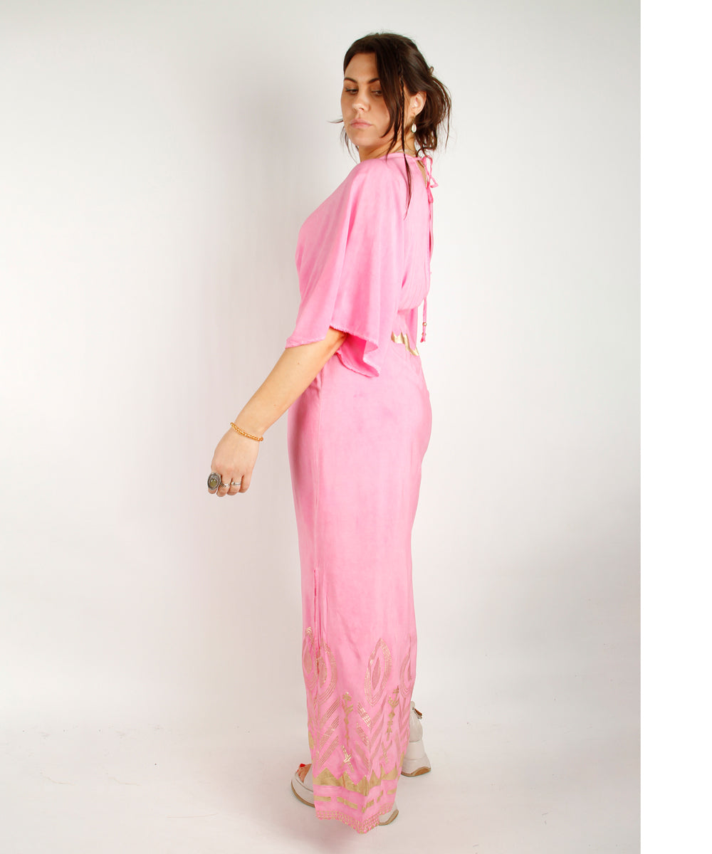 Nydelig kjole med gull detaljer, strikk i livet og knyting på toppen av ryggen.