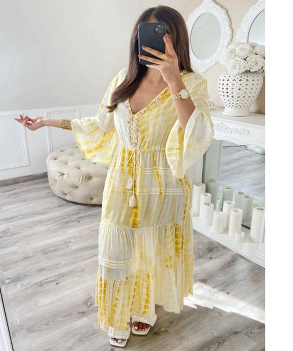 Deilig sommerkjole i gul batikk med dekorative skjell og snøring i livet.