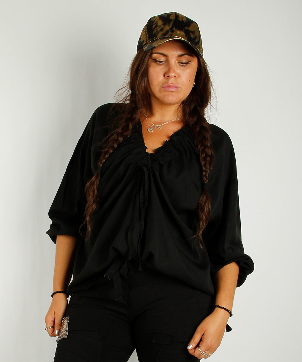 Denne blusen er er designet med rynket v-hals, med knyting for et feminint preg.