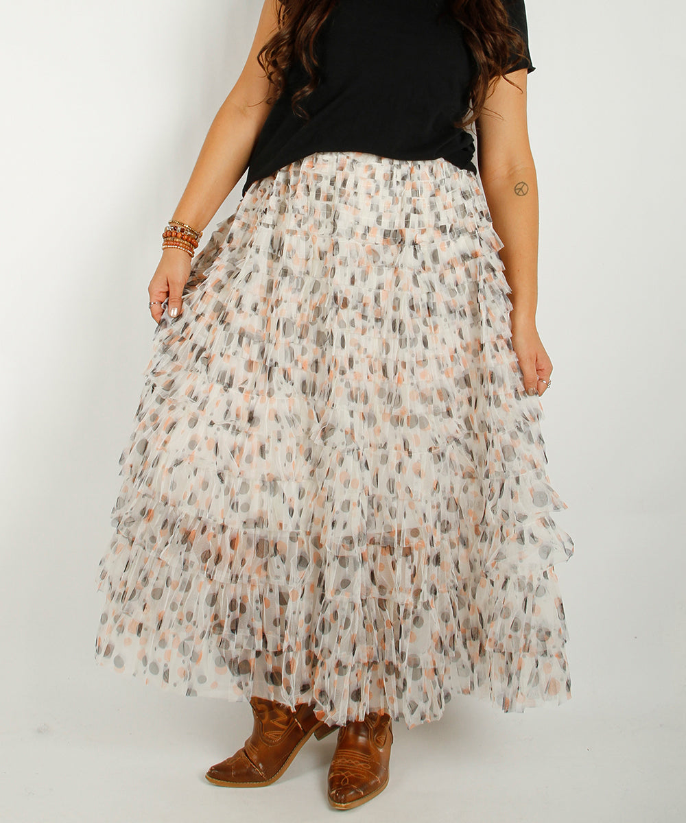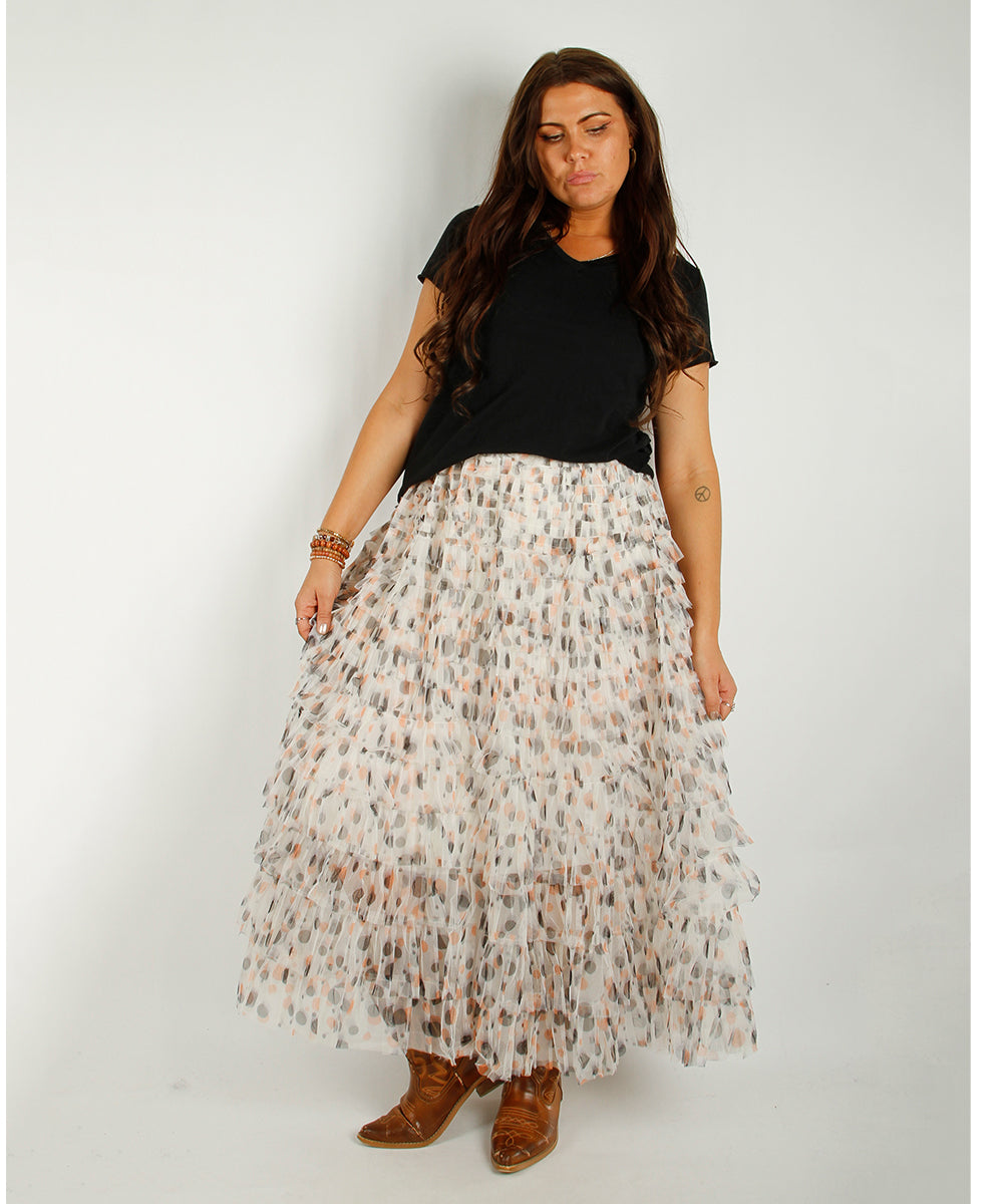 Dette elegante ankellange tyllskjørtet i A-fasong er perfekt for en feminin og sofistikert stil. Det har en elastisk strikk i midjen som gir deg muligheten til å justere midjehøyden etter ønske, slik at du kan tilpasse passformen til din egen komfort. Skjørtet er foret, noe som gir det en fyldigere look samtidig som det sikrer at det ikke er gjennomsiktig. Det lette tyllstoffet gir skjørtet en luftig og drømmende kvalitet, ideell for både festlige anledninger og en stilig hverdagslook.