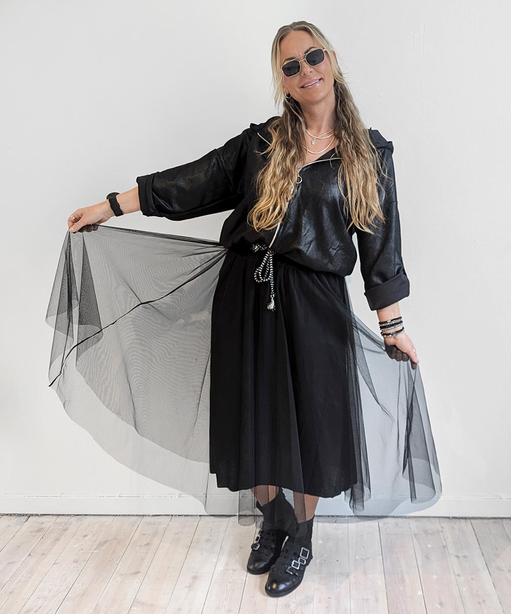 Dette elegante ankellange tyllskjørtet i A-fasong er perfekt for en feminin og sofistikert stil. Det har en elastisk strikk i midjen som gir deg muligheten til å justere midjehøyden etter ønske, slik at du kan tilpasse passformen til din egen komfort. Skjørtet er foret, noe som gir det en fyldigere look samtidig som det sikrer at det ikke er gjennomsiktig. Det lette tyllstoffet gir skjørtet en luftig og drømmende kvalitet, ideell for både festlige anledninger og en stilig hverdagslook.