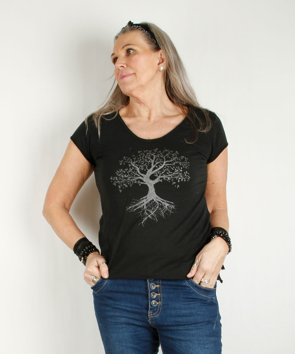 T-skjorten har v-hals og en flatterende feminin passform, den er litt lengre bak.