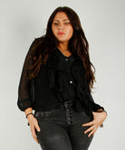 Blusen har en avslappet look og rysjer foran.