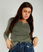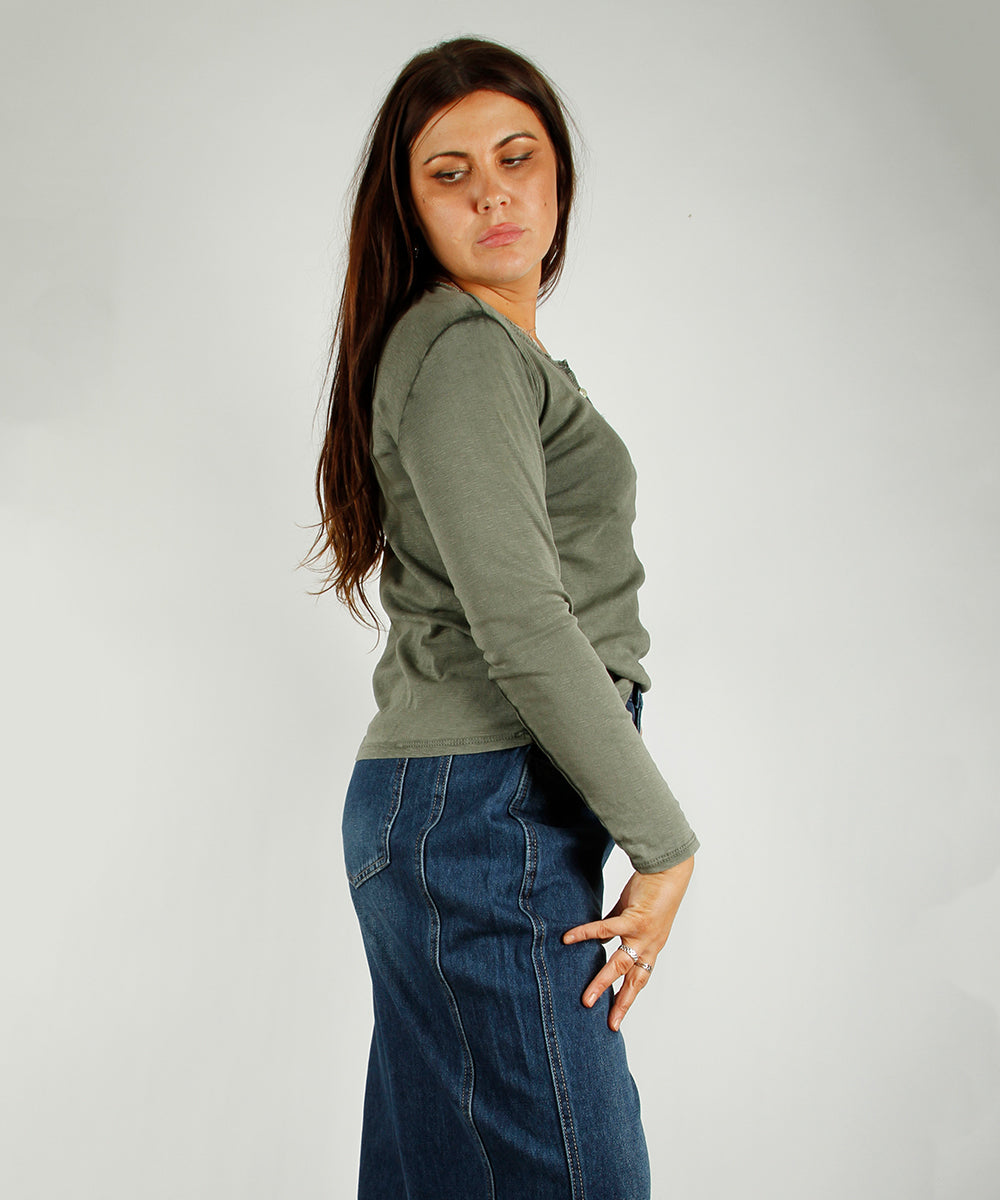 Langermet jerseytopp i bomull. V-hals med 3 pynteknapper. Myk og god stretch.