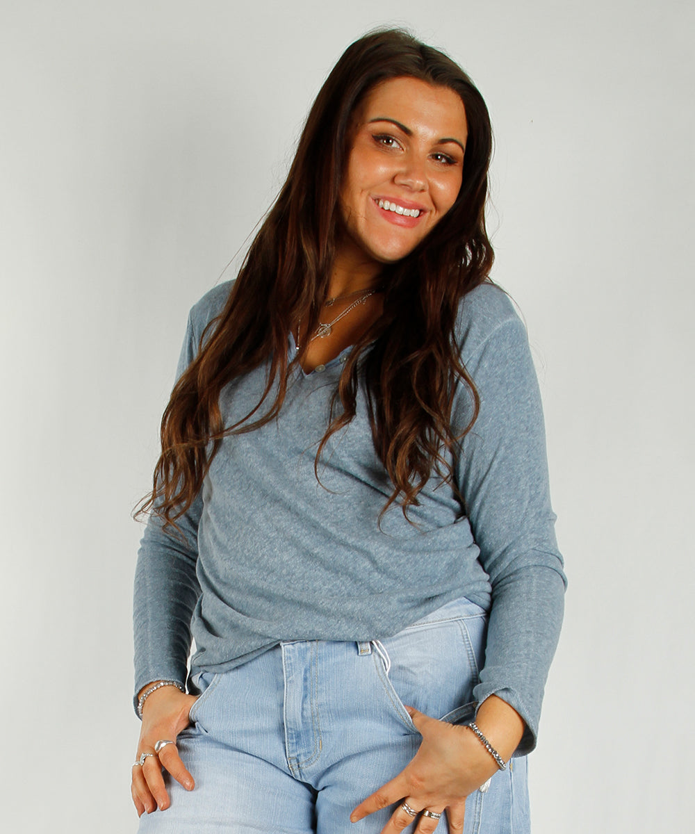 Langermet jerseytopp i bomull. V-hals med 3 pynteknapper. Myk og god stretch.
