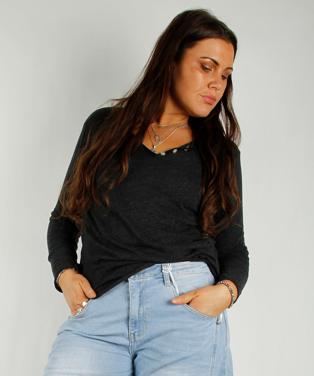 Langermet jerseytopp i bomull. V-hals med 3 pynteknapper. Myk og god stretch.