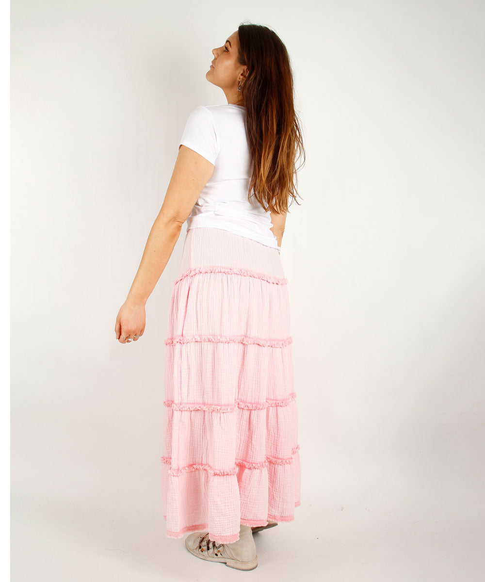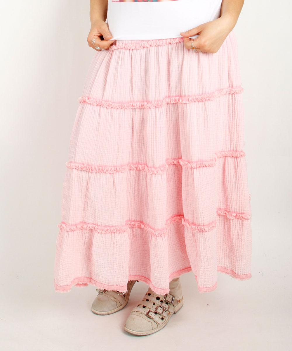 Dette bohemske skjørtet er både lekent og feminint. Perfekt for vår og sommer sesongen. Skjørtet har en lett krinklet struktur og består av flere lag med rysjer. som gir ekstra volum og bevegelse. Laget i myk bomull.