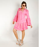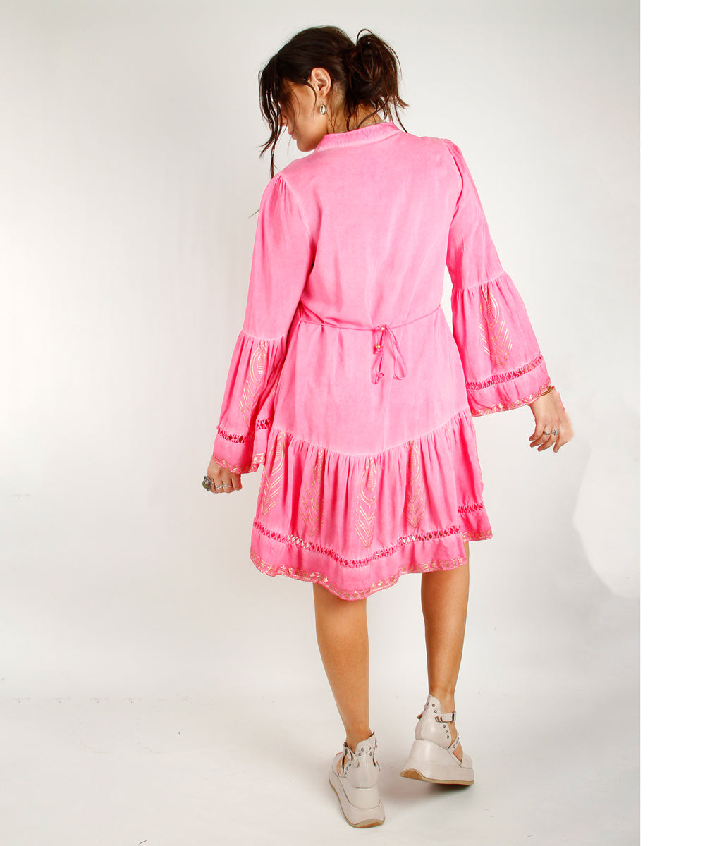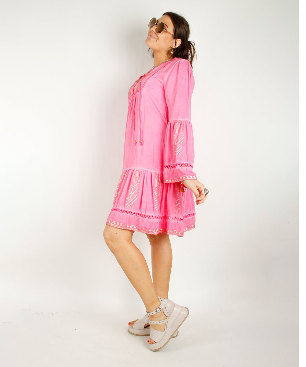Kort Viskose kjole med gulldetaljer, vide armer og knyting i livet.