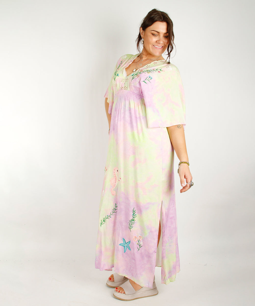 Nydelig sommerkjole i deilig viskose stoff med blomster broderier på brystet og dekorative sjø motiver nederst.