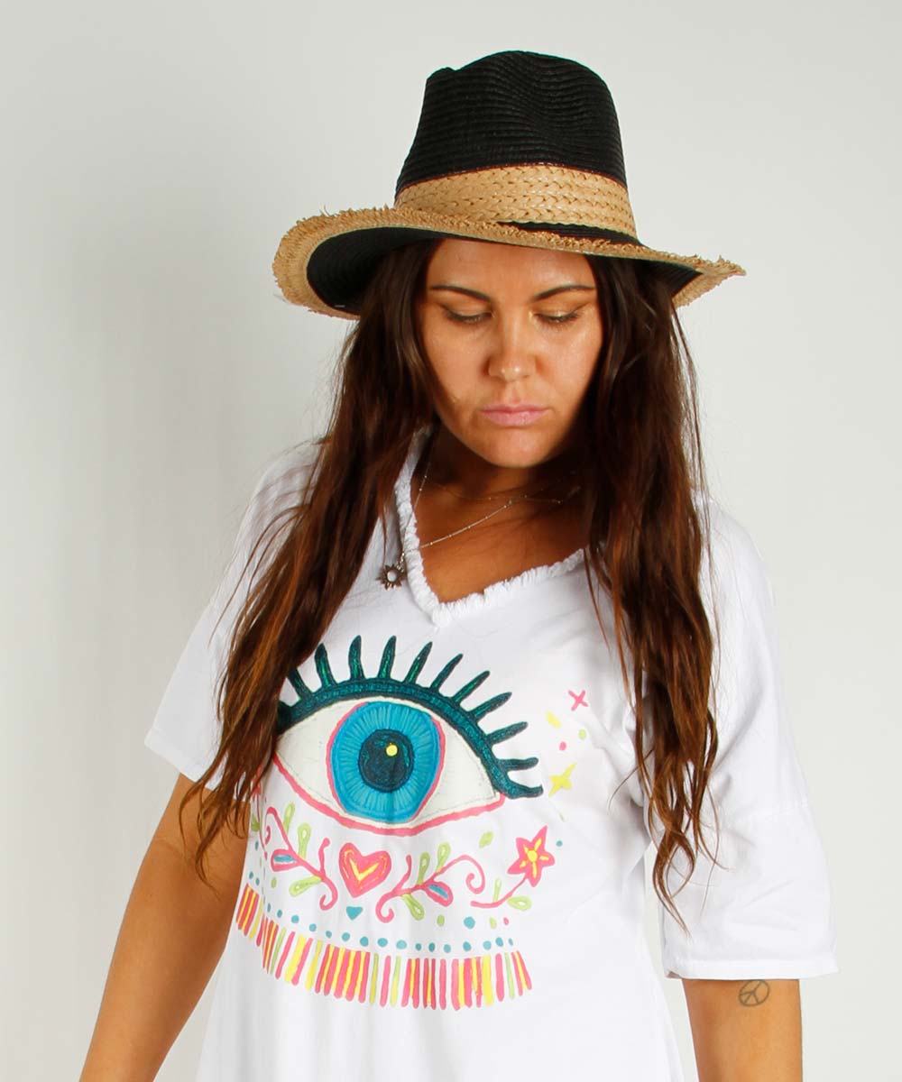 Denne sommerhatten er en essensiell accessoir for å holde seg kjølig og beskyttet mot solen, samtidig som den gir et elegant preg til sommerantrekket ditt.