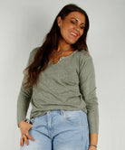 Langermet jerseytopp i bomull. V-hals med 3 pynteknapper. Myk og god stretch.
