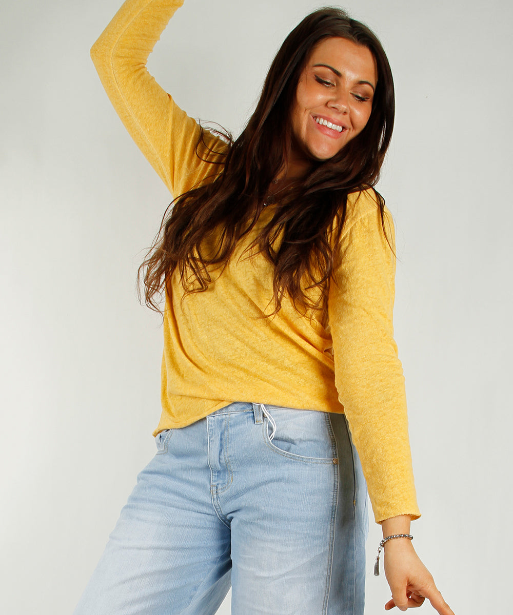 Langermet jerseytopp i bomull. V-hals med 3 pynteknapper. Myk og god stretch.