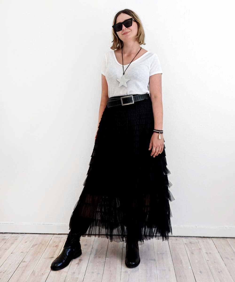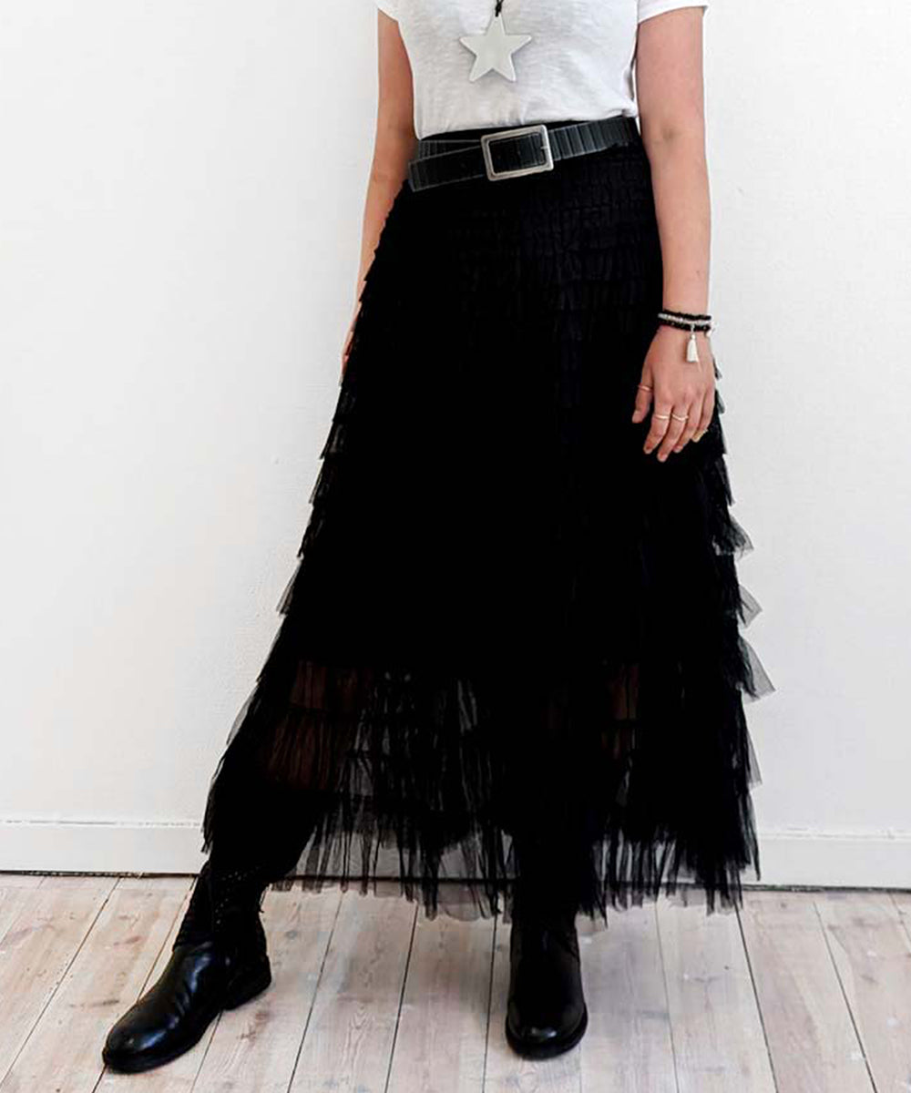 Dette elegante ankellange tyllskjørtet i A-fasong er perfekt for en feminin og sofistikert stil. Det har en elastisk strikk i midjen som gir deg muligheten til å justere midjehøyden etter ønske, slik at du kan tilpasse passformen til din egen komfort. Skjørtet er foret, noe som gir det en fyldigere look samtidig som det sikrer at det ikke er gjennomsiktig. Det lette tyllstoffet gir skjørtet en luftig og drømmende kvalitet, ideell for både festlige anledninger og en stilig hverdagslook.